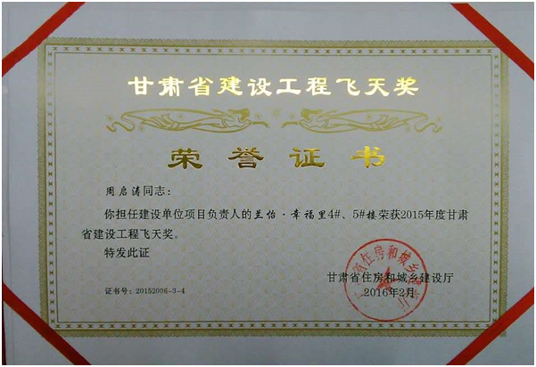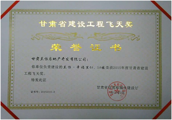 2016年2月5日,由甘肅省住房和城鄉(xiāng)建設廳評選的2015年度甘肅省建設工程“飛天獎”對社會各界發(fā)布,本次共發(fā)布41個“飛天獎”項目。其中,由甘肅中集實業(yè)集團子公司甘肅蘭怡房地產開發(fā)有限公司開發(fā)建設的中集·幸福里憑借高品質的開發(fā)標準,喜獲甘肅省2015年度建設工程“飛天獎”榮譽稱號,成為蘭州市安寧區(qū)唯一獲此殊榮的項目。